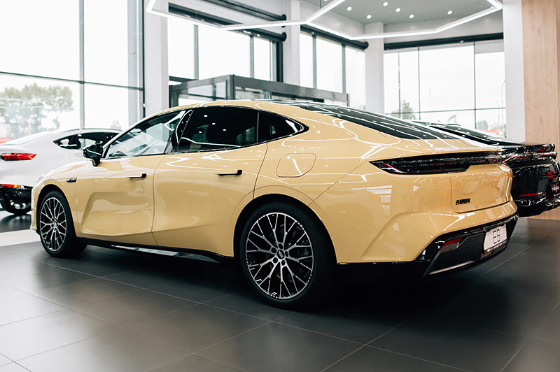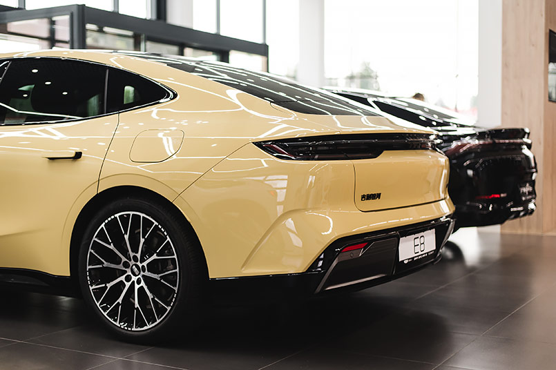 В экстерьере E8 – сочетание динамики и минимализма: цельная светодиодная линия Stellar Vision, плавные контуры кузова и выдвижные дверные ручки подчеркивают аэродинамическую форму автомобиля.