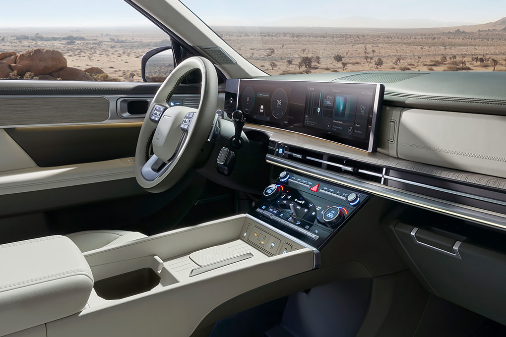 Салон Hyundai Santa Fe (MX5) – это радикальный отход от плавных форм прошлых поколений. Здесь доминируют прямые горизонтальные линии, объединённые воздуховоды и большие поверхности. Главная особенность интерьера – два сдвоенных экрана диагональю 12,3 дюйма каждый: цифровая приборная панель и мультимедийная система с меню на русском языке.