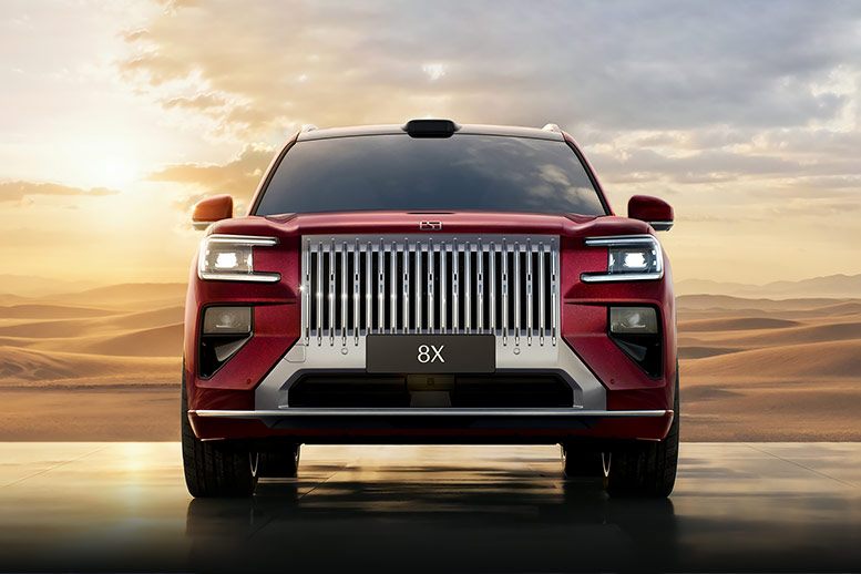 Zeekr 8X — это премиальный среднеразмерный кроссовер, который своим экстерьером во многом наследует стилистику старшего собрата 9X. Автомобиль отличается массивной решеткой радиатора с вертикальными элементами в стиле «водопад» и характерной раздельной головной оптикой. Передние фары имеют С-образную форму и, в зависимости от комплектации, могут включать в себя тысячи ромбовидных граней, создающих уникальную световую подпись.